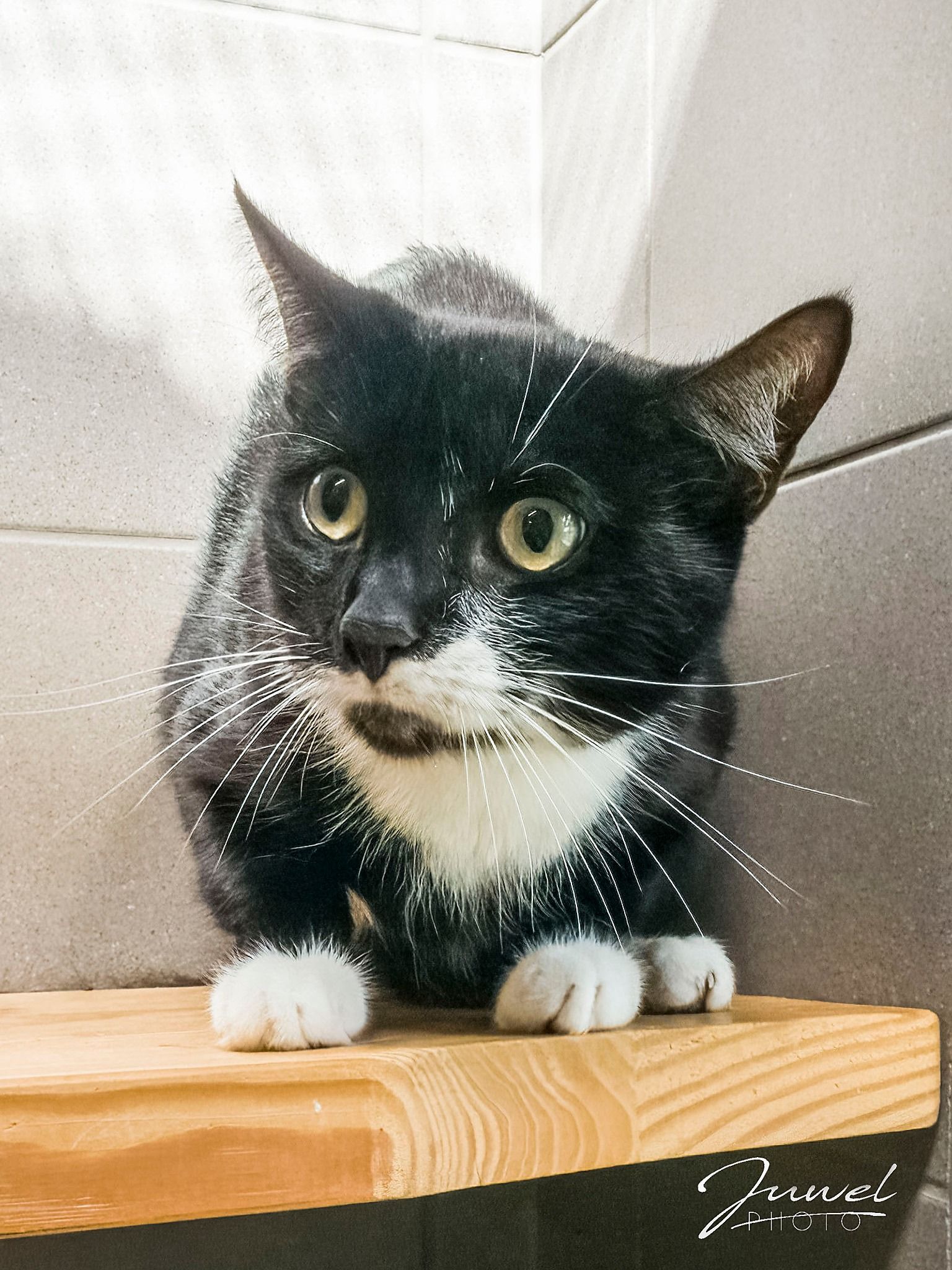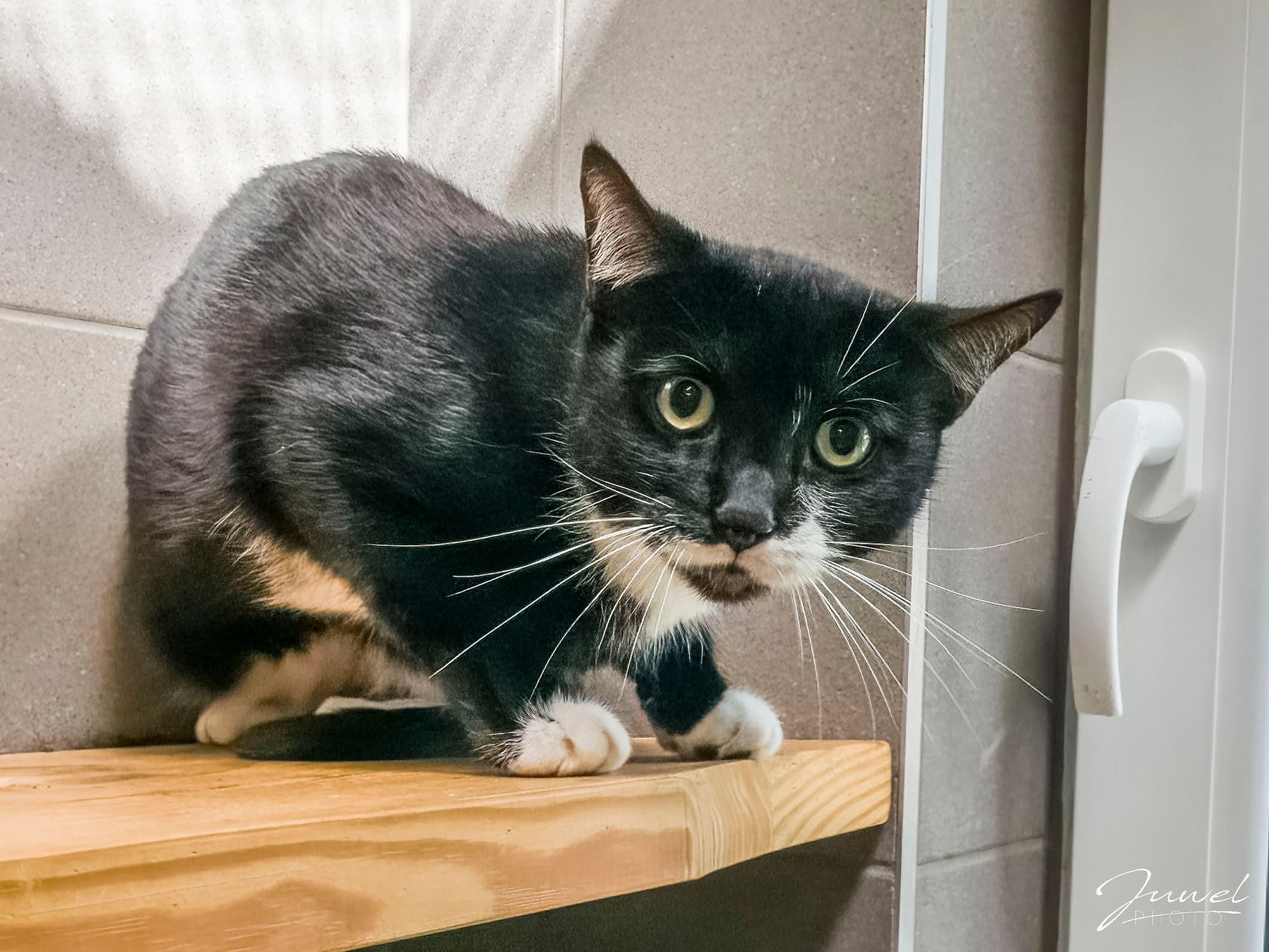 To bardzo wrażliwa kotka, która jest przestraszona nową dla siebie sytuacją. Jest u nas krótko. Nie znamy jej przeszłości. Oczekuje na spokojnego człowieka, który cierpliwością przełamie jej lęki.