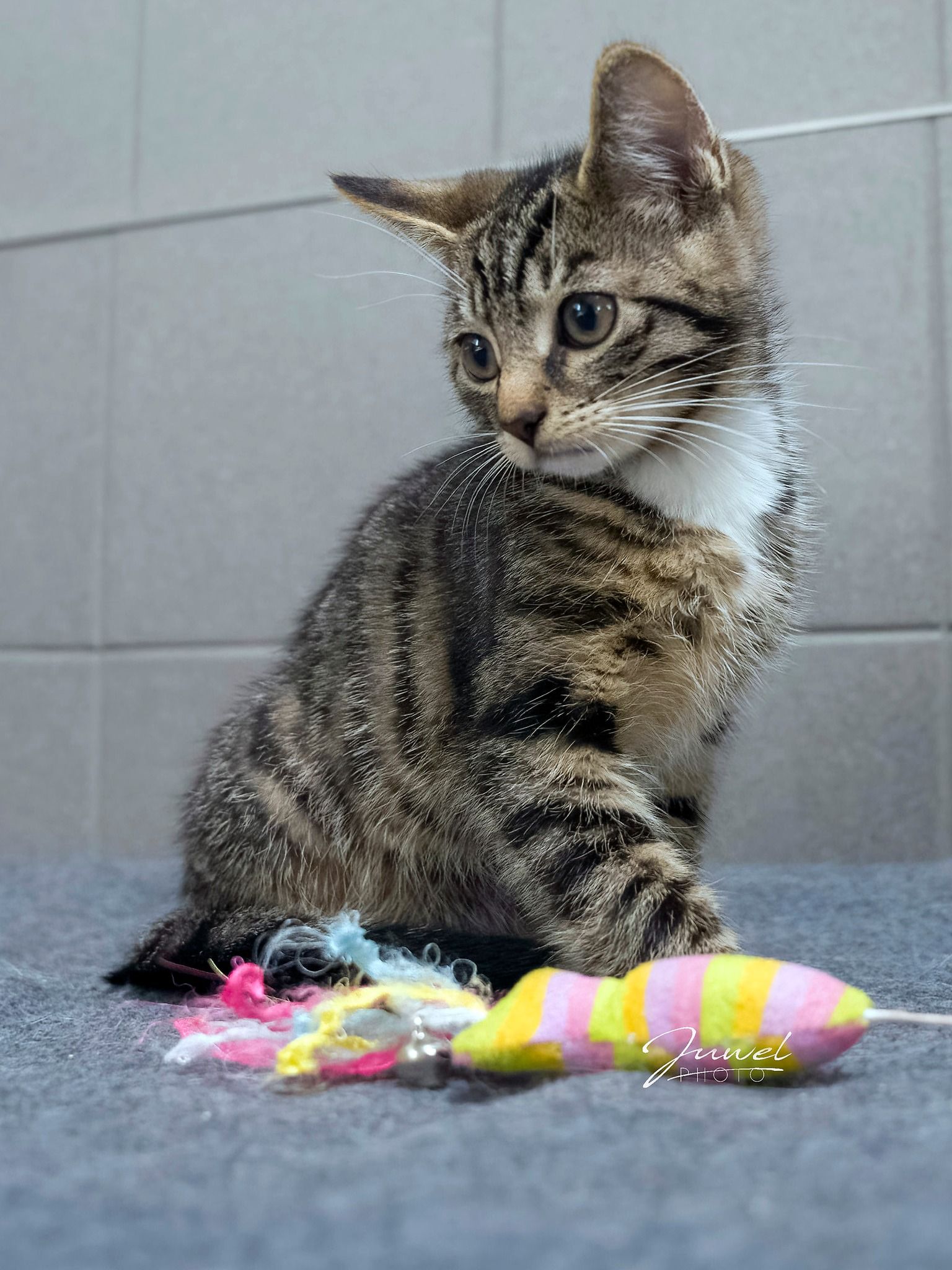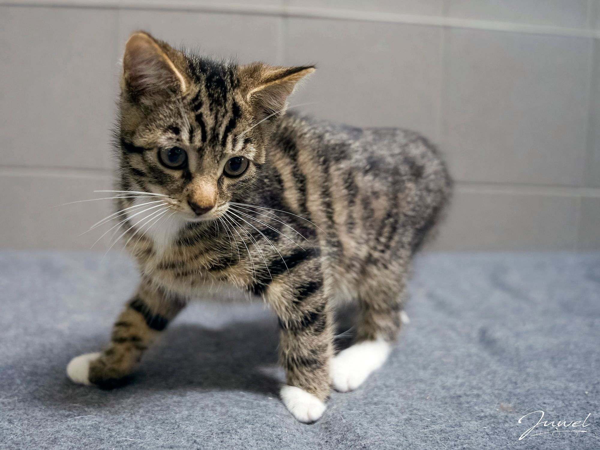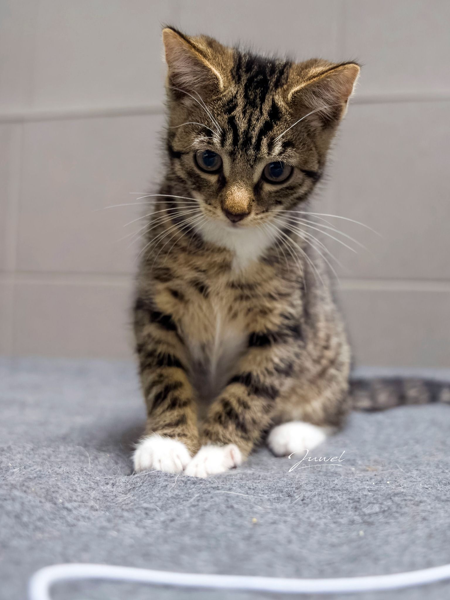 To mały, szary pręgowany kotek z uroczymi białymi znaczeniami na pyszczku i łapkach. Jego sierść przypomina tygrysie futro – cieniowana, pełna kontrastów, z wyrazistym wzorem pręgów, który podkreśla jego drapieżny, choć wciąż dziecięcy wygląd. Jego ciekawskie, szeroko otwarte oczy zawsze wypatrują przygód, a sprężyste ruchy i czujne uszy sprawiają, że wygląda jak mały dziki kot gotowy na polowanie…