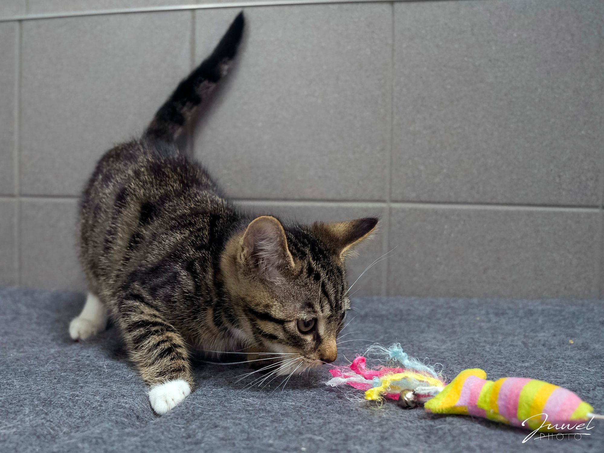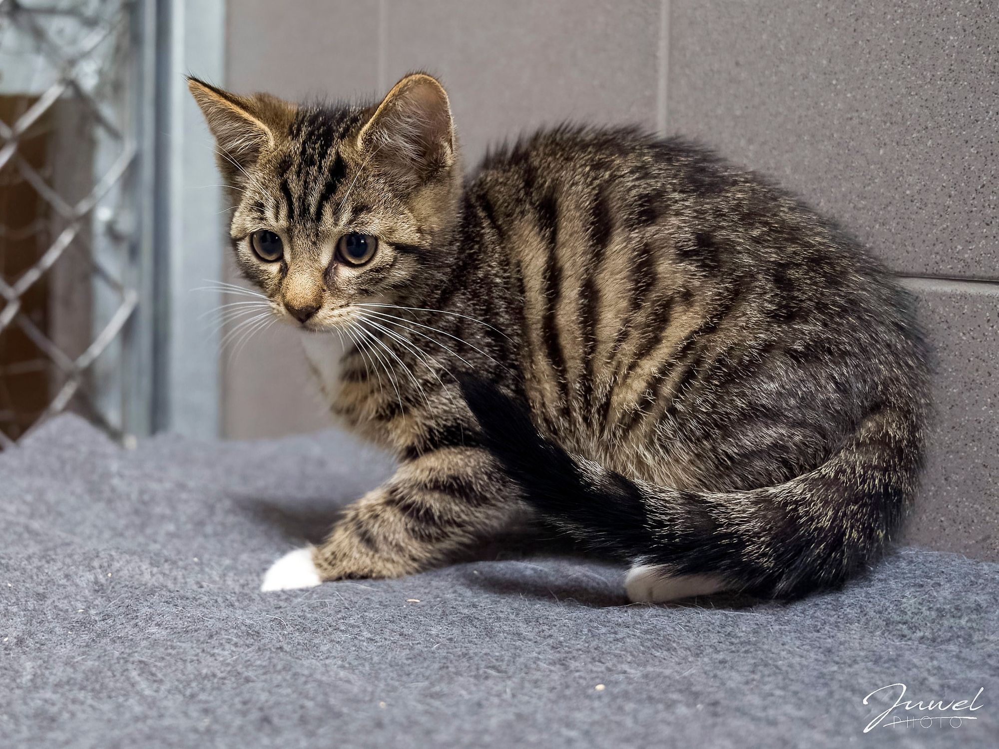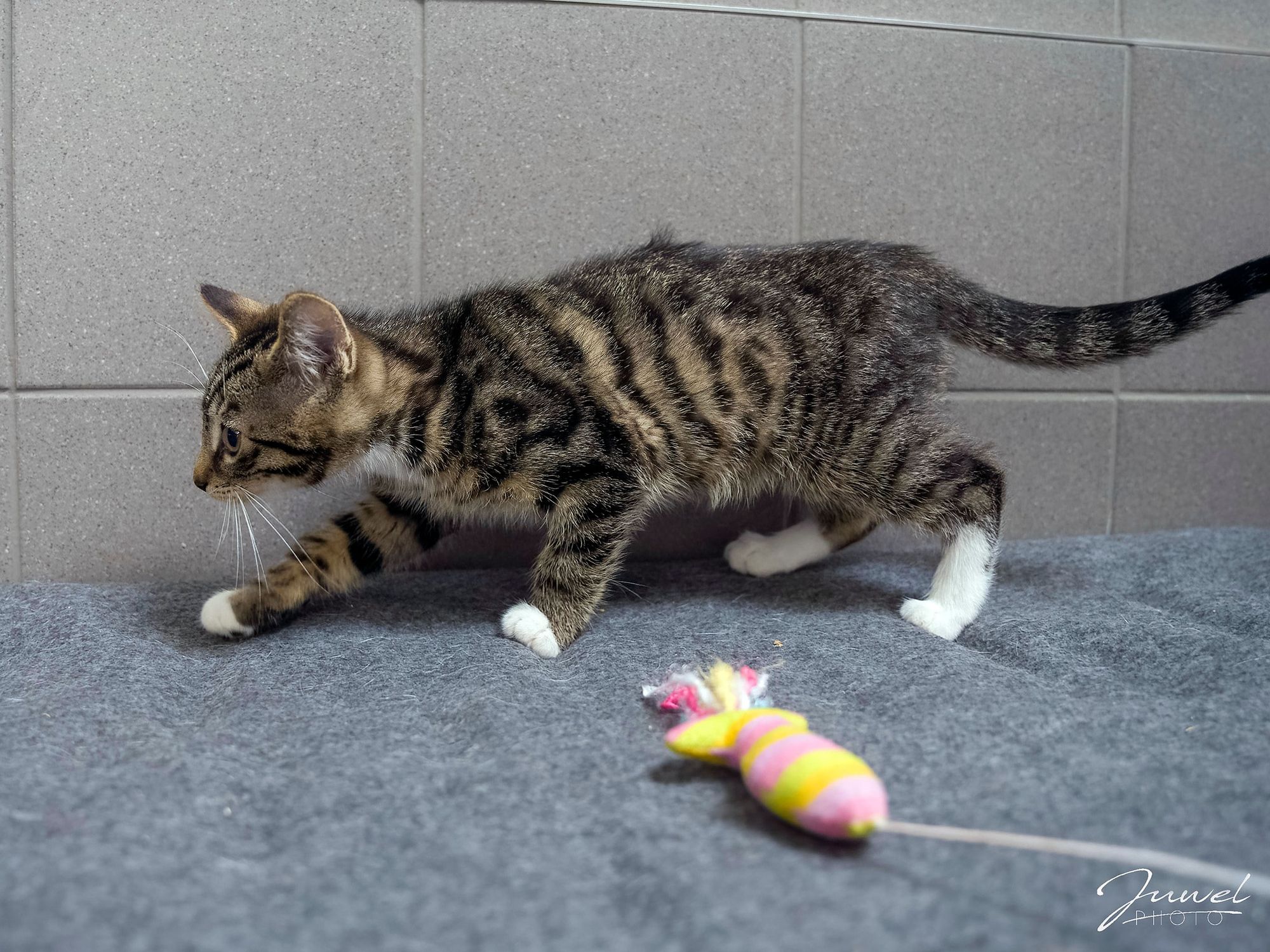 To mały, szary pręgowany kotek z uroczymi białymi znaczeniami na pyszczku i łapkach. Jego sierść przypomina tygrysie futro – cieniowana, pełna kontrastów, z wyrazistym wzorem pręgów, który podkreśla jego drapieżny, choć wciąż dziecięcy wygląd. Jego ciekawskie, szeroko otwarte oczy zawsze wypatrują przygód, a sprężyste ruchy i czujne uszy sprawiają, że wygląda jak mały dziki kot gotowy na polowanie…