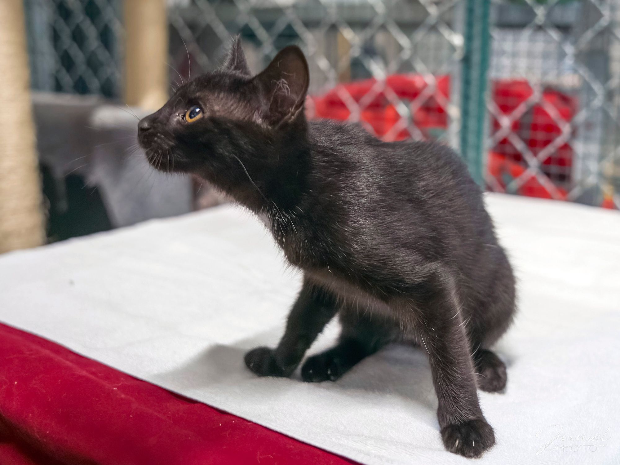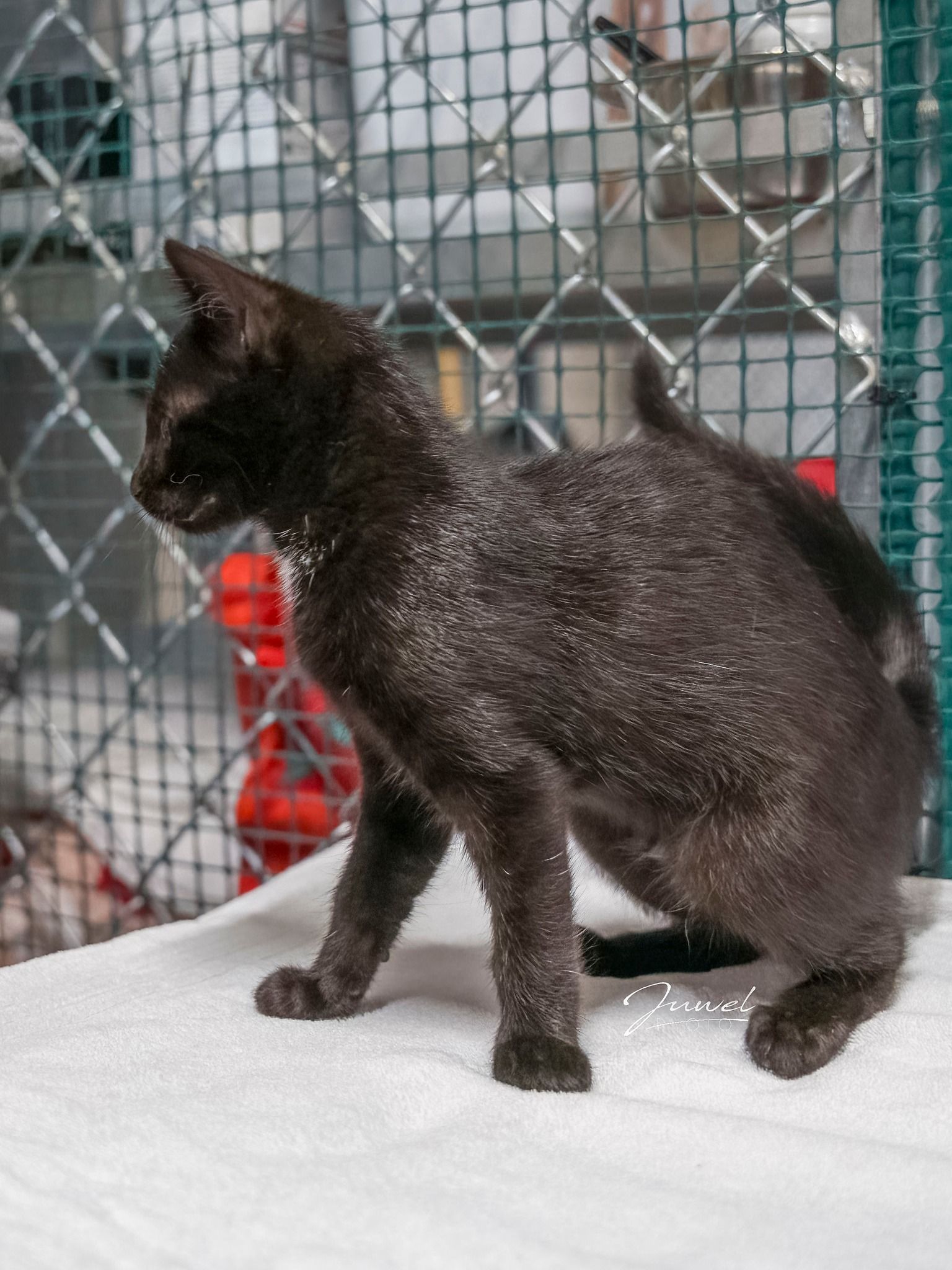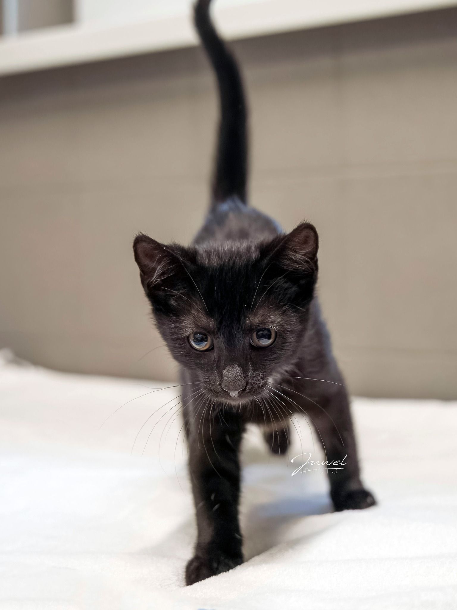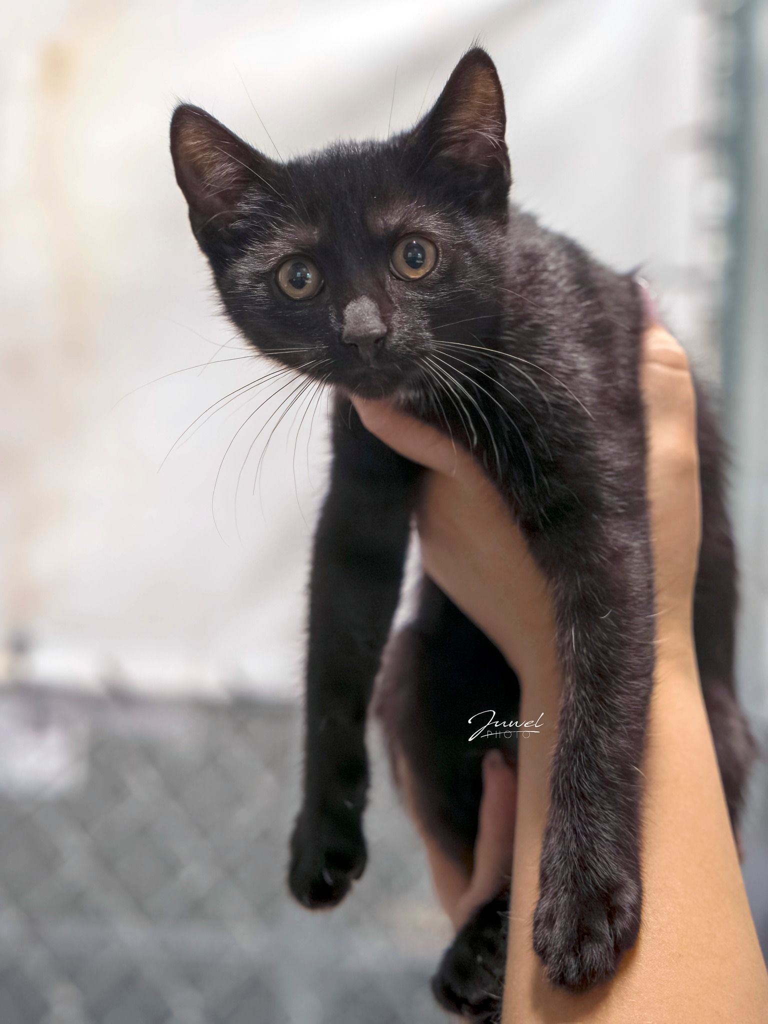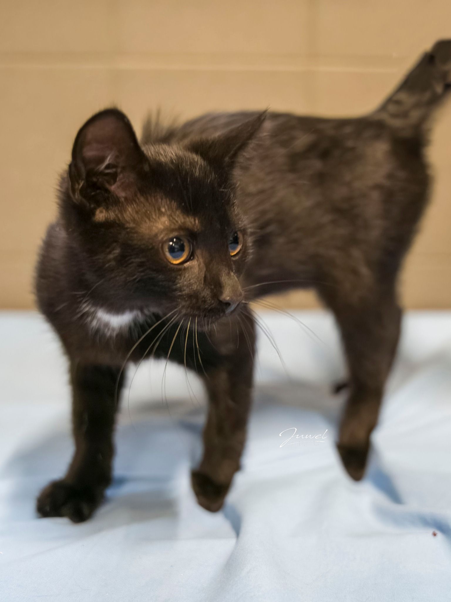 To drobny, biało-czarny kotek z charakterystyczną, uroczą białą plamką na szyi. Choć jeszcze malutki, już teraz pokazuje swój ciekawski charakter – wszystko musi zobaczyć, dotknąć i sprawdzić.