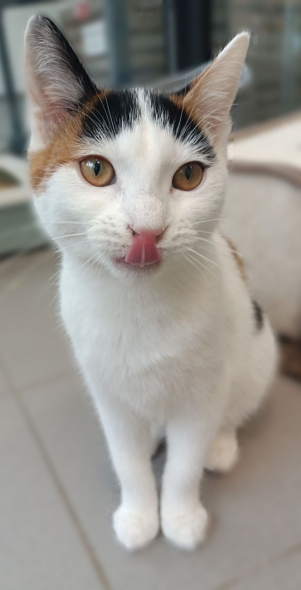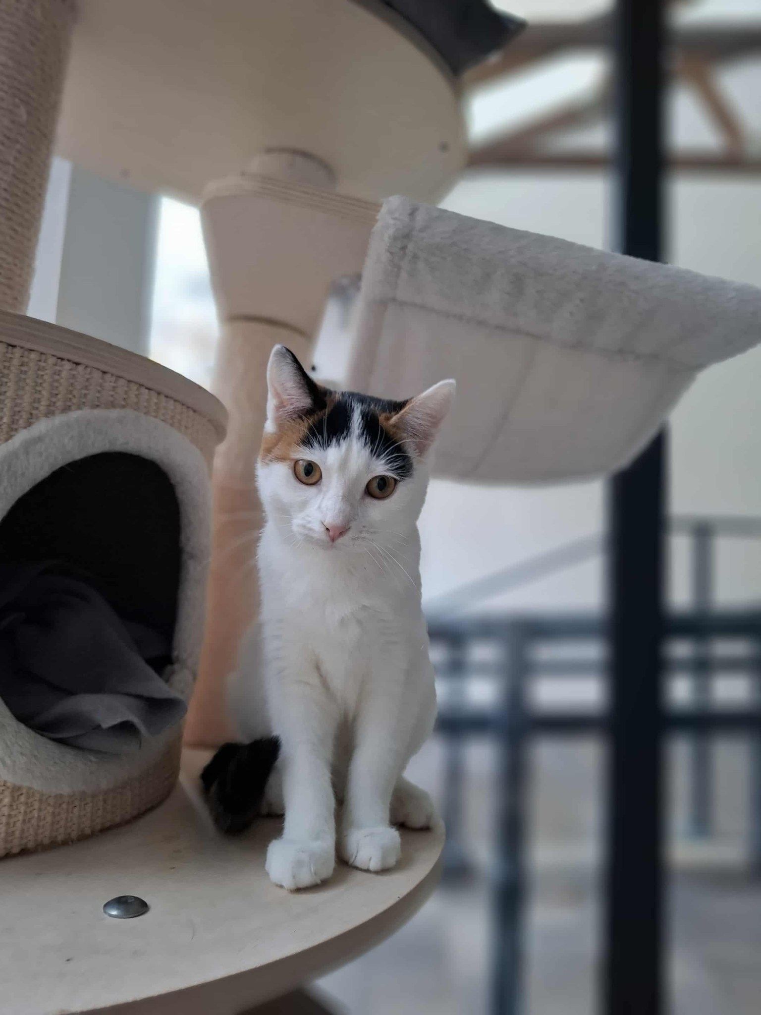 To młoda, urocza kotka o trójkolorowym futerku (tricolorka). Jest delikatna i ostrożna — na początku może być nieco nieufna wobec nowych osób i otoczenia. Potrzebuje trochę czasu, by się oswoić, ale gdy już poczuje się bezpiecznie, pokazuje swoje czułe i towarzyskie oblicze. Idealna dla kogoś cierpliwego, kto da jej przestrzeń, by zaufała we własnym tempie.